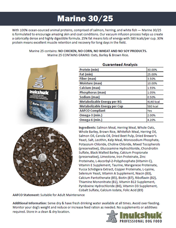 With 100% ocean-sourced animal proteins, comprised of salmon, herring and white fish – Marine 25 is loaded with omega’s 3, and 6, and encourages amazing skin and coat conditions. Our vacuum infusion process creates a calorically dense, nutrient rich, and highly digestible formula. 25% fat means loads of energy with 580 kcals/per cup. 30% protein means excellent muscle retention and recovery for long days in the field hunting, hiking or pulling the sled.